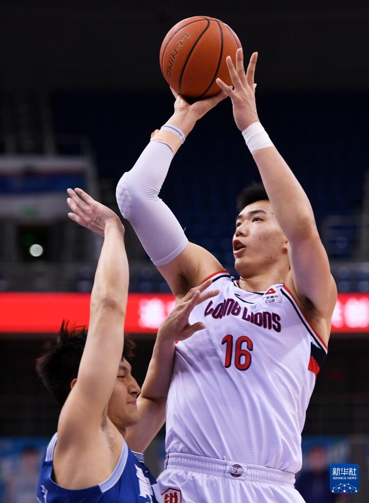 3月21日,广州龙狮队球员焦泊乔(右)在比赛中投篮。新华社记者 李紫恒 摄
