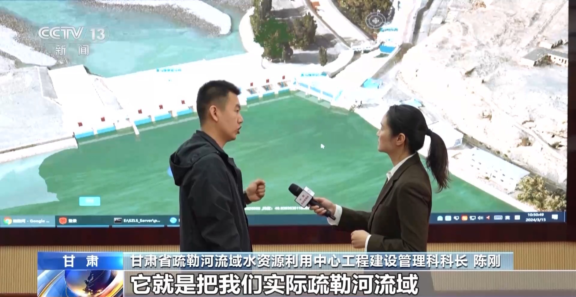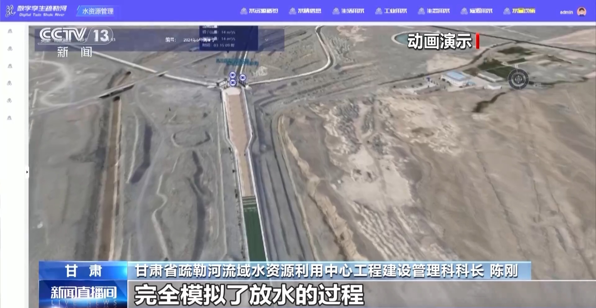 甘肃省疏勒河流域水资源利用中心工程建设管理科科长 陈刚:在这个上面可以看到我们放水的整个路线,完全模拟了放水的整个过程,以及它到达下一级之后它的时间和过闸的流量。这样的话我们的调度人员可以提前知道在几点几分过闸的流量,可以提前对闸门进行远程的操控。