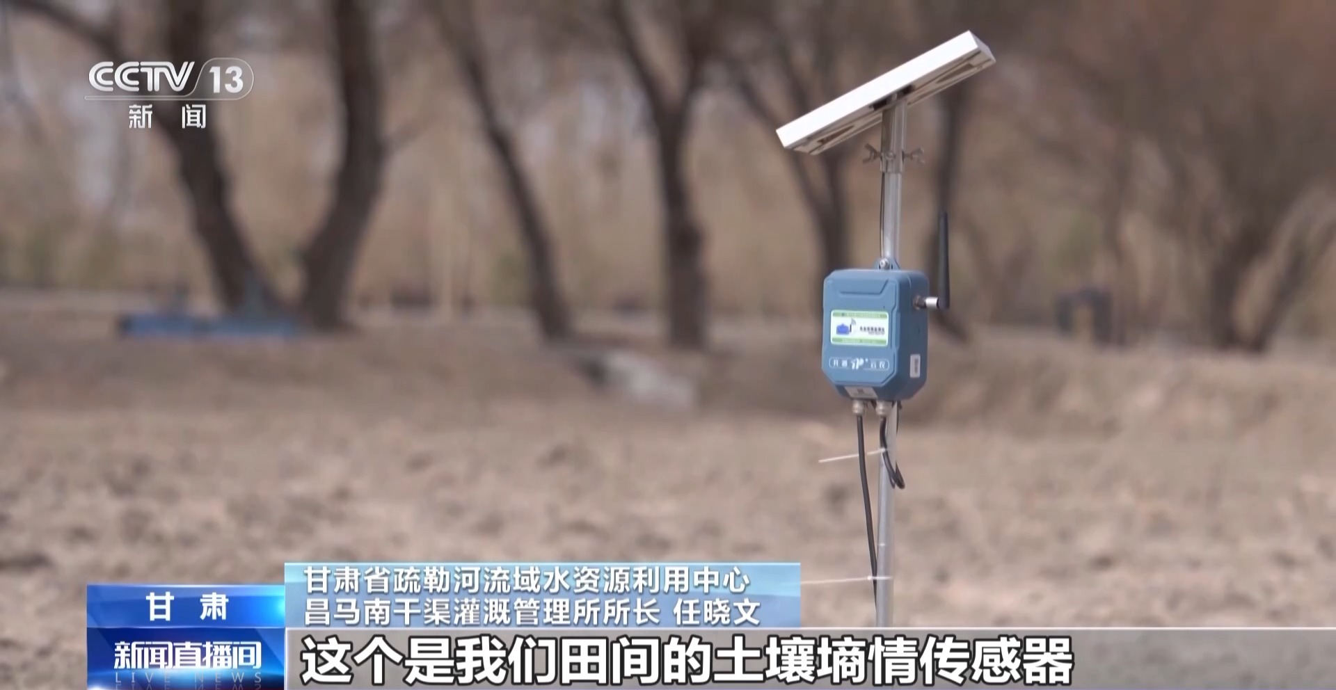 甘肃省疏勒河流域水资源利用中心 昌马南干渠灌溉管理所所长 任晓文:这个是我们田间的土壤墒情传感器,它可以监测10到50厘米土层的含水率,这个是田间微型气象站。