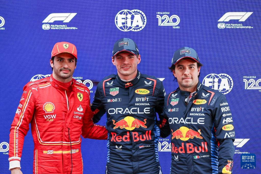 3月23日, 红牛车队荷兰车手维斯塔潘(中)、墨西哥车手佩雷兹(右)和法拉利车队西班牙车手塞恩斯在排位赛后合影。新华社发(钱俊摄)
