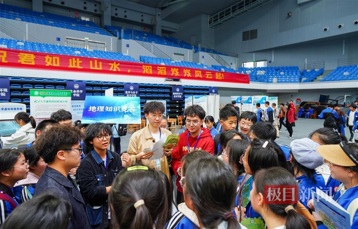 这次高中生赏樱专场活动主场设在卓尔体育馆内,武汉大学34个学院、130个本科专业、多个学生兴趣社团“摆摊”接受咨询,并各显神通,向来访的高中生推介武大魅力、学院风采。测绘学院的展位前,一台新型智能导航定位车载平台引人注目,吸引了大批高中生前来围观。武汉大学测绘学院的研究生付元辰,向学弟学妹们详细介绍了这项技术的运作机制和应用领域,“许多同学都对各种各样的传感器和它们的功能十分感兴趣,他们也很好奇,想了解在未来的学习过程中,我们学院硬件平台的配置能够提供多少丰富的学习资源。”