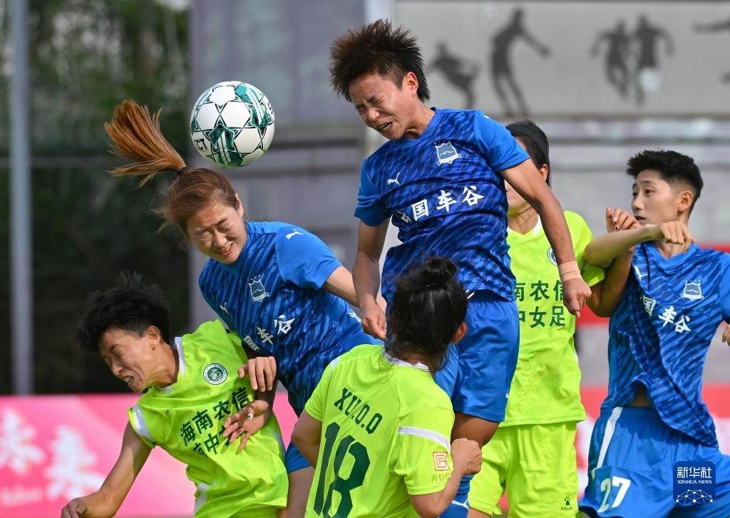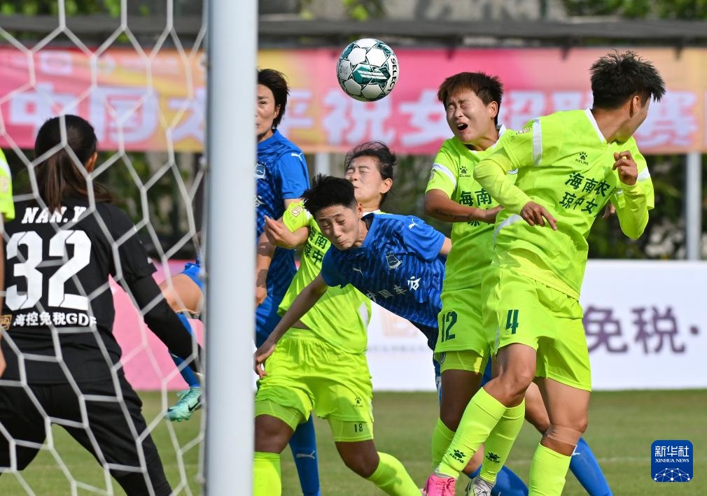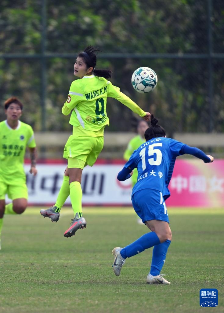 3月23日,海南农信琼中女足队球员宋宇晴(右二)在比赛中争顶。新华社记者 郭程 摄
