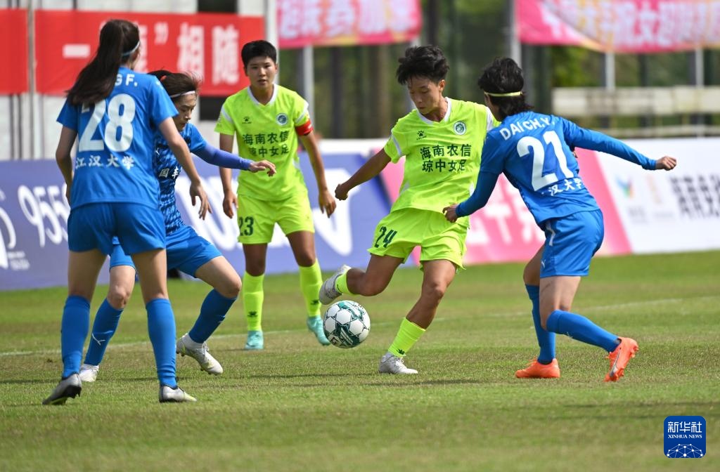 3月23日,海南农信琼中女足队球员苏育萱(右二)在比赛中传球。新华社记者 郭程 摄