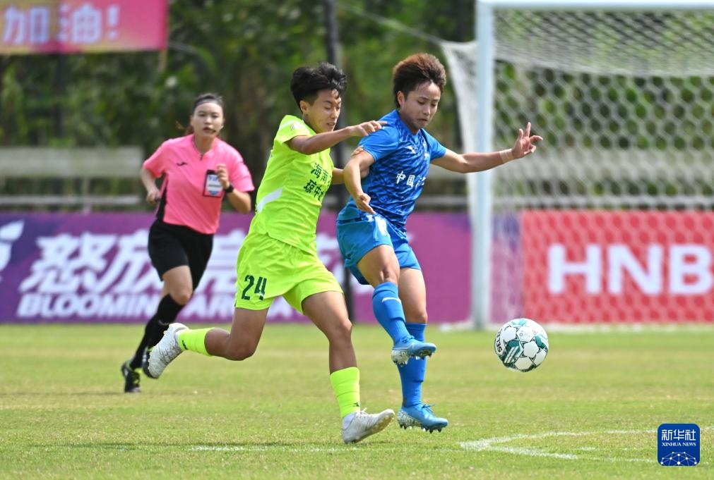 3月23日,武汉车谷江大队球员张琳艳(右)和海南农信琼中女足队球员苏育萱在比赛中拼抢。新华社记者 郭程 摄