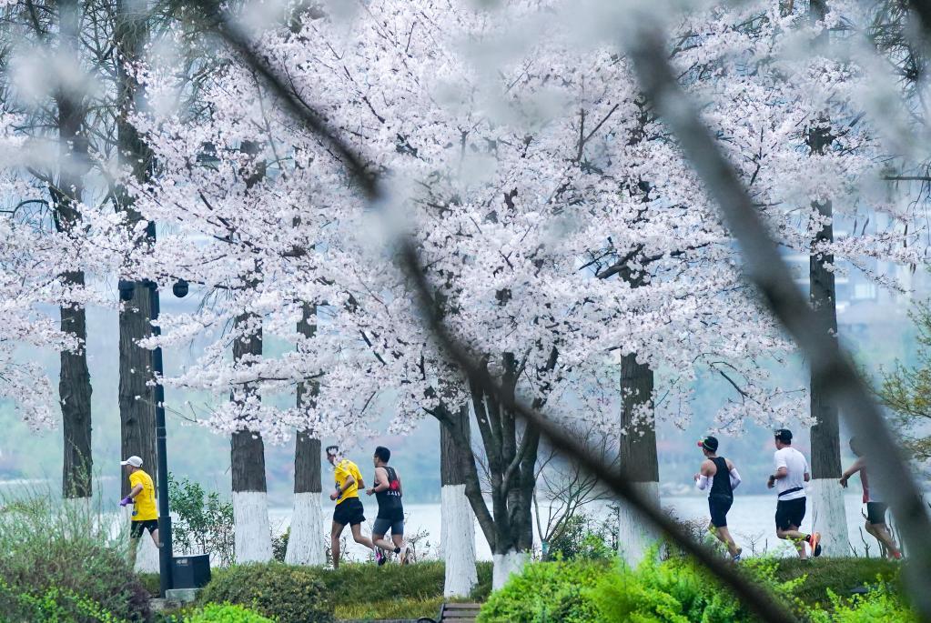 3月24日,参赛选手经过武汉东湖绿道。新华社记者 程敏 摄
