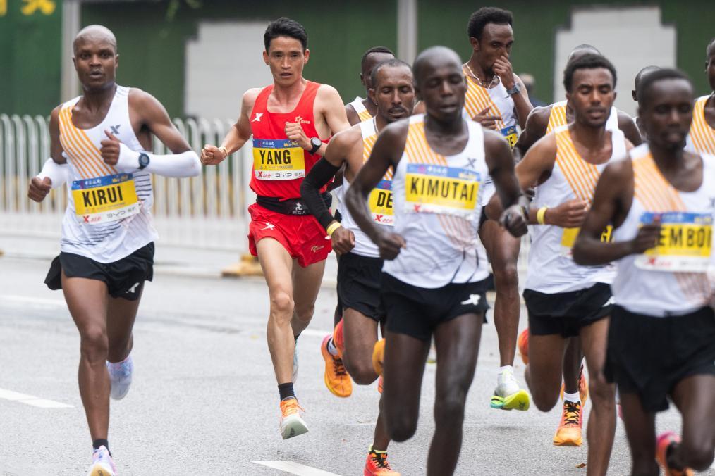 3月24日,中国选手杨定宏(左二)在比赛中。他以2小时12分06秒的成绩成为全程马拉松男子组首位冲线的中国选手。新华社记者 肖艺九 摄