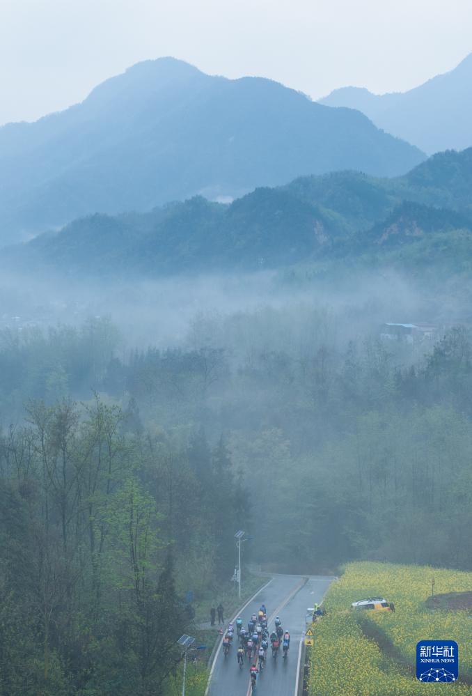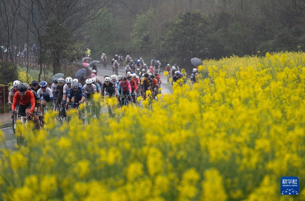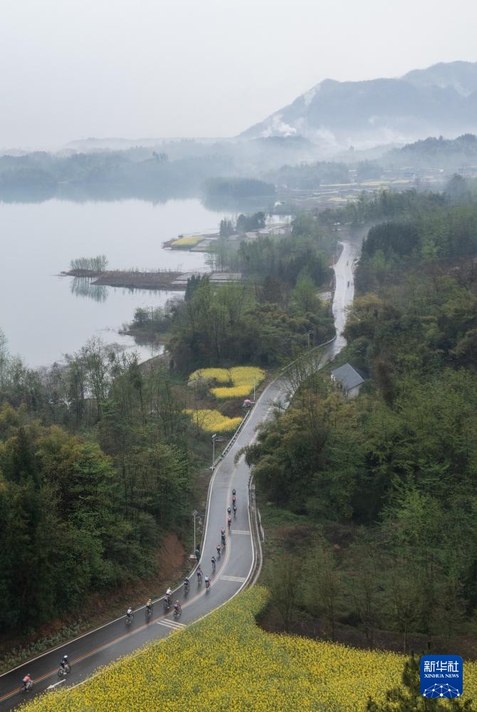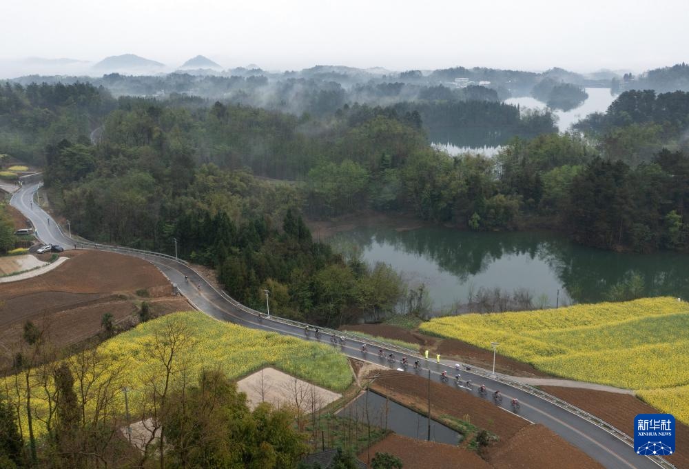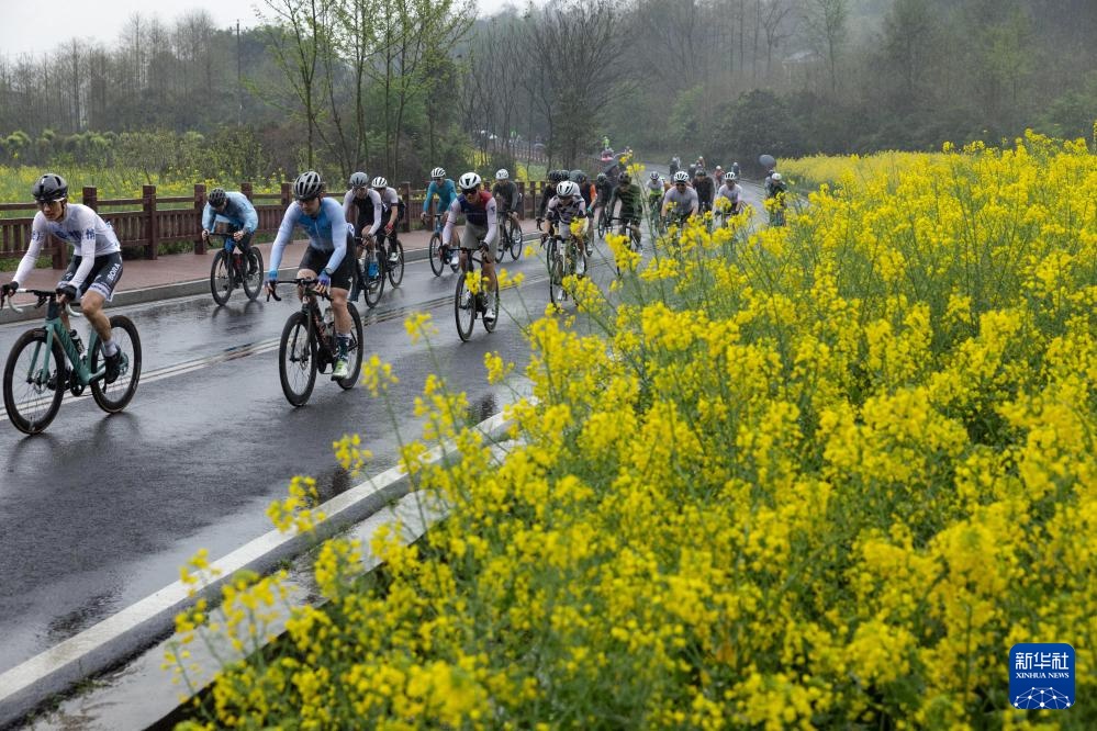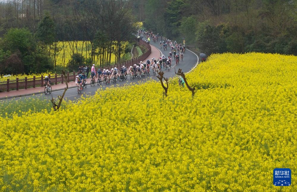3月24日,男子公路精英组选手经过安州区桑枣镇一片油菜花海。新华社记者 江宏景 摄
