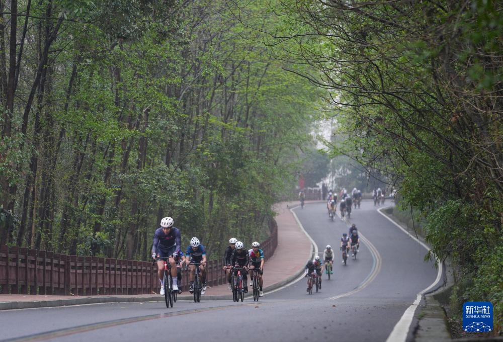 3月24日,选手们骑行在环白水湖绿道上。新华社记者 江宏景 摄