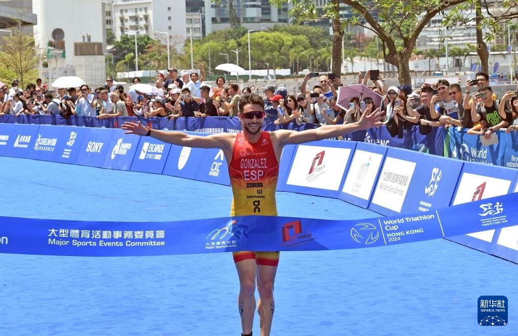 3月24日,西班牙选手冈萨雷斯·加西亚在男子精英组比赛中冲线。最终,他以53分17秒的成绩获得冠军。新华社记者 卢炳辉 摄