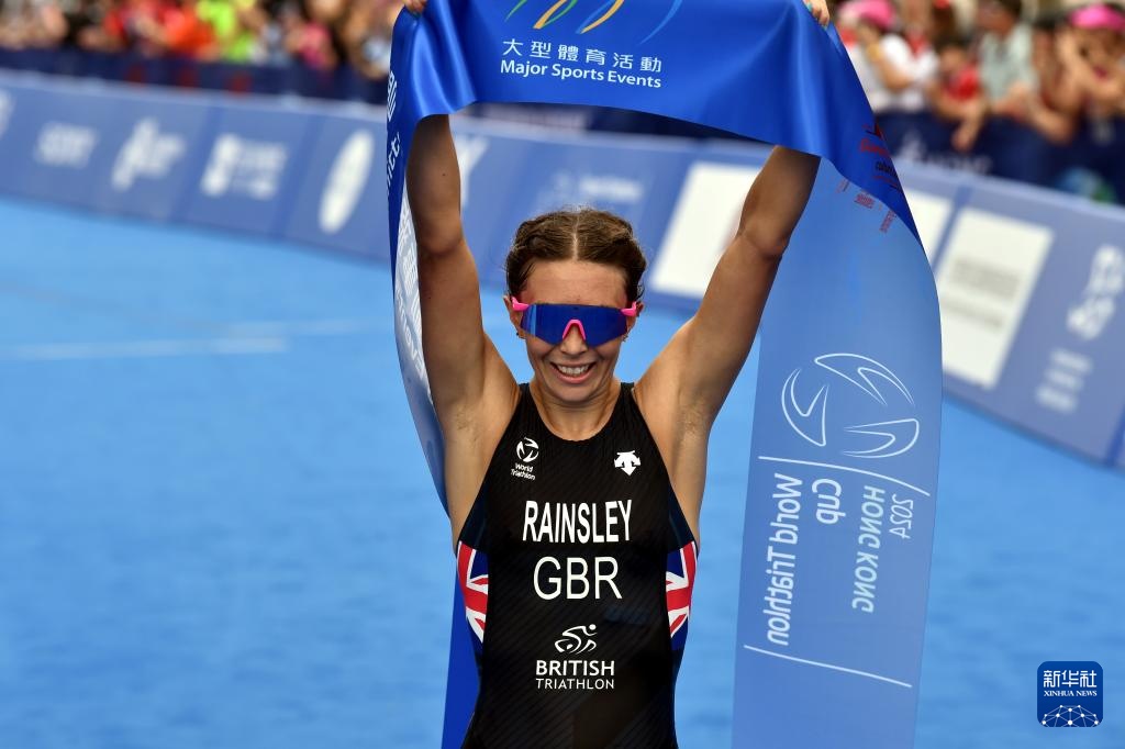 3月24日,英国选手兰斯利在女子精英组比赛中冲线。最终,她以59分44秒的成绩获得冠军。新华社记者 卢炳辉 摄