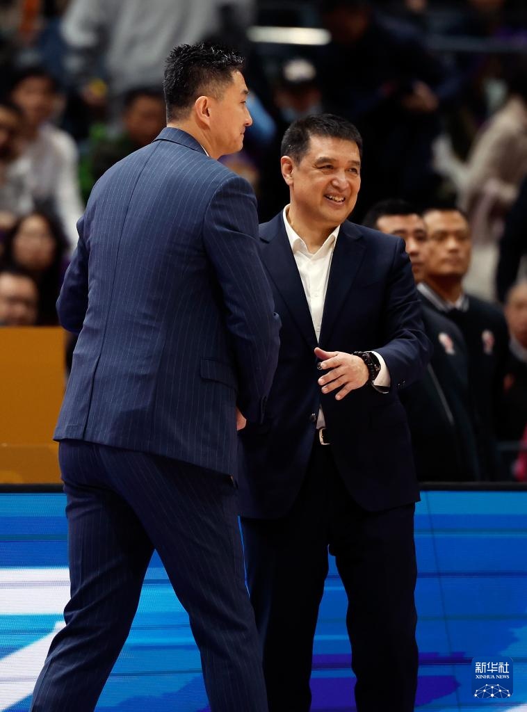 3月24日,北京控股队主教练闵鹿蕾(右)在赛后与广东华南虎队主教练杜锋互相致意。新华社记者 王丽莉 摄