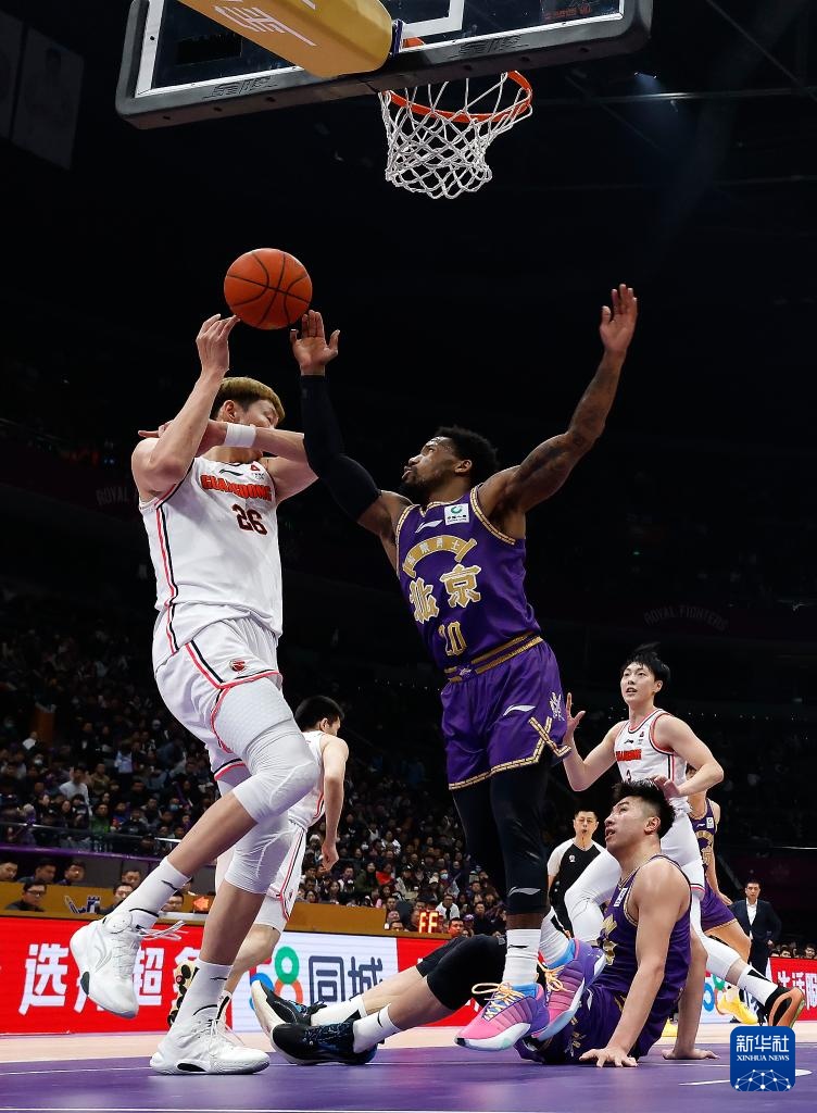 3月24日,北京控股队球员凯·费尔德(下)在比赛中进攻失败,广东华南虎队球员克拉伦斯·威姆斯(右一)得球反攻。新华社记者 王丽莉 摄