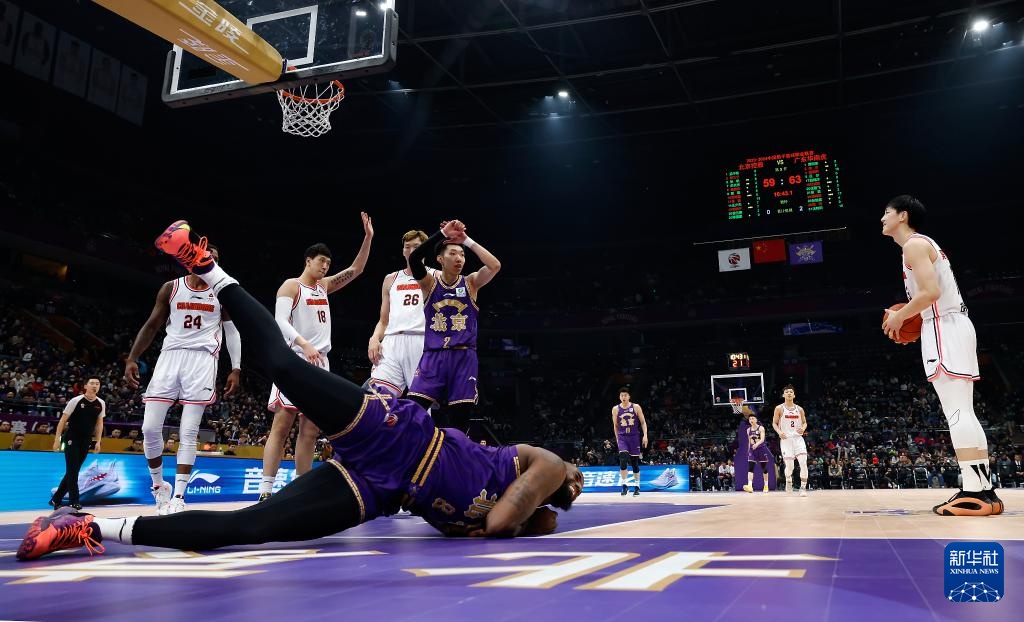3月24日,北京控股队球员廖三宁(紫衣2号)在比赛中向裁判员示意对方球员向队友贾卡尔·桑普森(下)犯规。新华社记者 王丽莉 摄