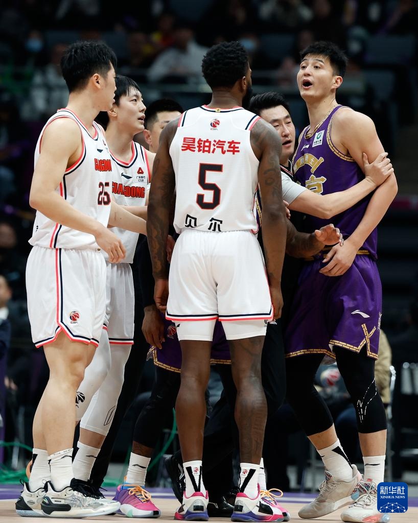 3月24日,北京控股队球员俞长栋(右一)在比赛中向广东华南虎队球员乔丹·贝尔(右三)表达不满。新华社记者 王丽莉 摄