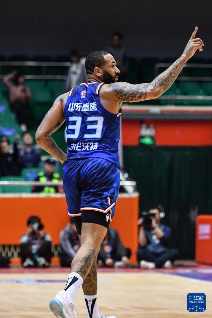 3月24日,山东高速队球员吉伦沃特在比赛中庆祝得分。新华社记者 朱峥 摄