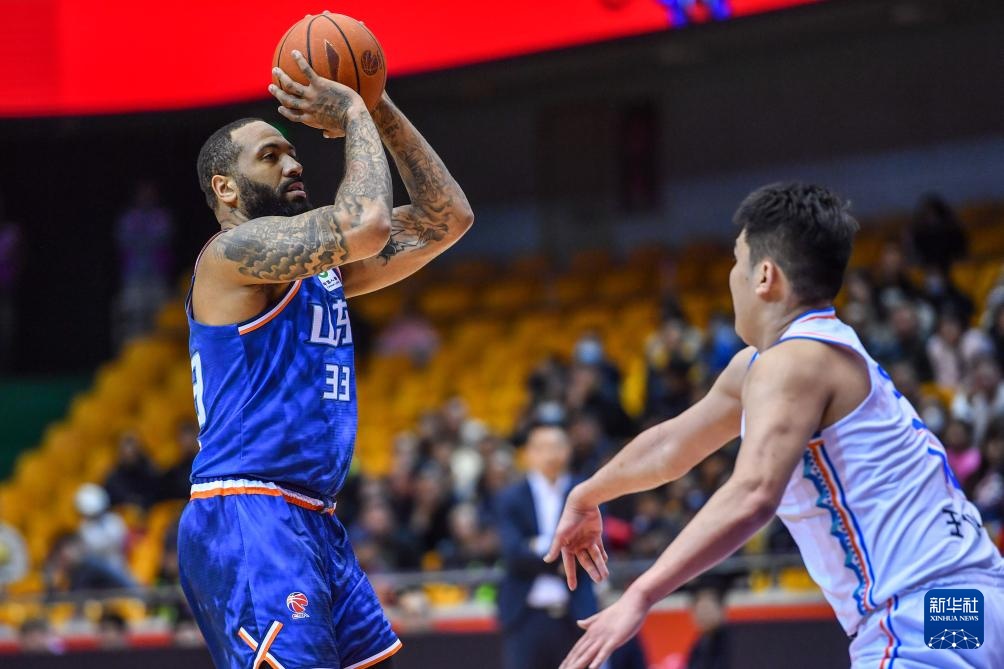 3月24日,山东高速队球员吉伦沃特(左)在比赛中投篮。新华社记者 朱峥 摄