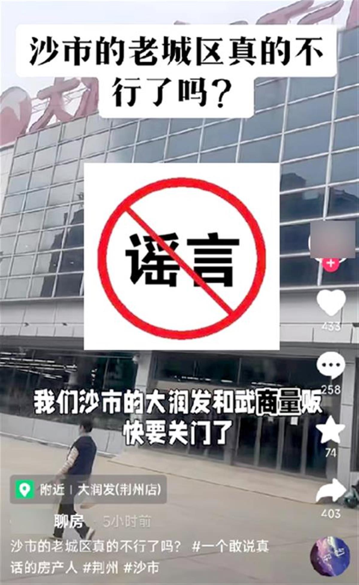 3月22日,荆州一位从事二手房销售的自媒体人在某短视频平台发布信息称:沙市的大润发和武商量贩超市快要关门了,沙市的老城区真的不行了吗?该信息称,荆州城区继某连锁超市暂停营业后,又将有多家大型超市即将倒闭。消息发布后,帖文浏览量超过10万次,转发评论量超千条,并一度引起当地市民热议。