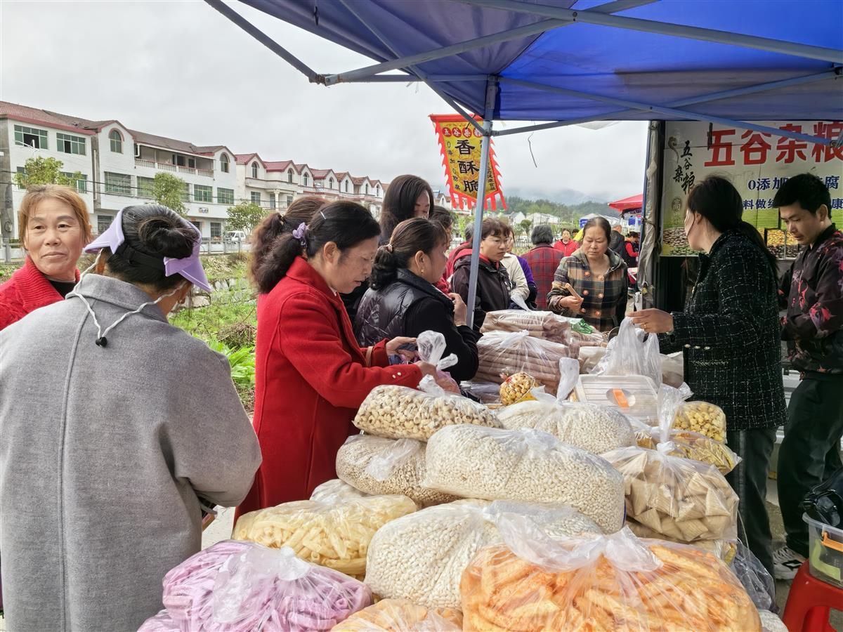 不少当地村民借赶集的东风,在家门口摆出小摊,卖自家出产的青菜、红薯、花生、板栗,以及茶叶、中药材、土鸡蛋、油面、豆糕等,具有浓郁鄂东地区地方特色的农副产品摆得琳琅满目。