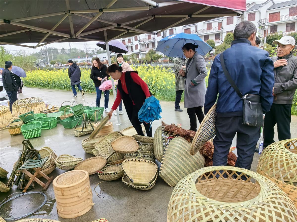 3月25日,湖北省黄冈市英山县南河镇二分垸村举办首场农副产品交易会,造型别致的小篮子,可以手提的坐具——马扎,用竹子做的多层蒸笼、鱼篓……这些大城市里难得一见的民间生活器物吸引了280余家商户参与,罗田、英山、浠水、白莲河等周边50公里内的上千名群众,冒雨前来选购。
