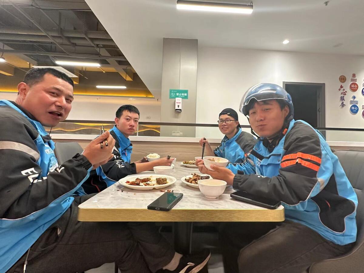 下午一点,外卖小哥们三三两两来到“小哥食堂”,外卖小哥覃宏修带着站点的三个同事一同前来就餐,“菜品丰富,味道不错,关键还经济实惠,10元就能吃饱吃好。自打发现这个宝藏食堂,我就向站点其他同事推荐,这里都快变成员工食堂了。”覃宏修说。