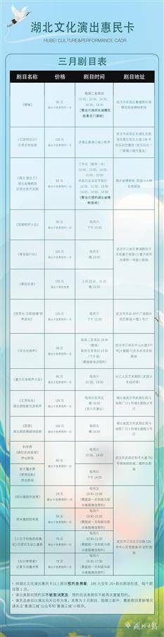 据悉,游客购买激活年卡后,可在365天内预约观看超过20家演出剧目,演出场地武汉三镇全覆盖,目前演出剧目名单正在逐步完善中。未来,“湖北文化演出惠民卡”还将开发更多附加玩法,带动武汉剧院剧场发展,为武汉文旅产业增添更多出游新玩法,促进武汉文旅演出市场繁荣发展。感兴趣的市民游客可关注公众号“惠演江城”咨询购买。