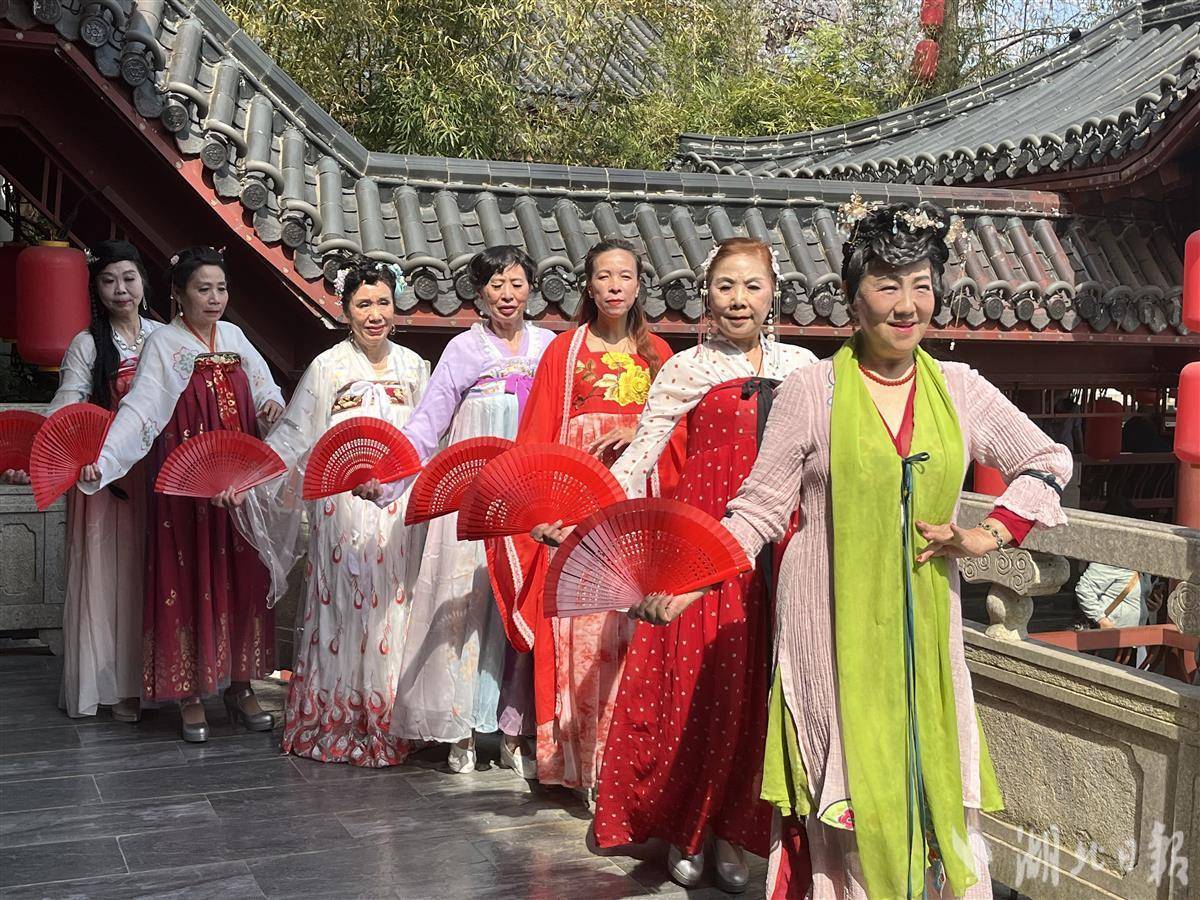 一旁,6名来自老年大学的婆婆,身着唐制汉服儒裙,手持团扇,排成一排,在亭子里翩翩起舞,引得不少市民驻足观看。“衣服实在太漂亮了,很喜欢。”65岁的领队严婆婆说,这是她们第一次尝试汉服。