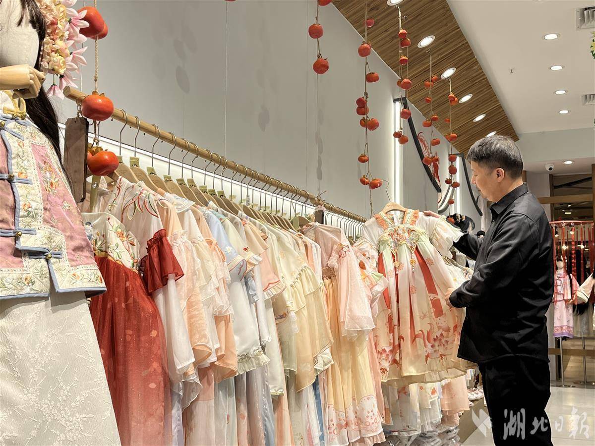 3月25日,走进汉正街各大服饰市场,很多店铺挂起了旗袍、马面裙、对襟外套等各式各样的新中式服装,不少消费者正在参观选购。