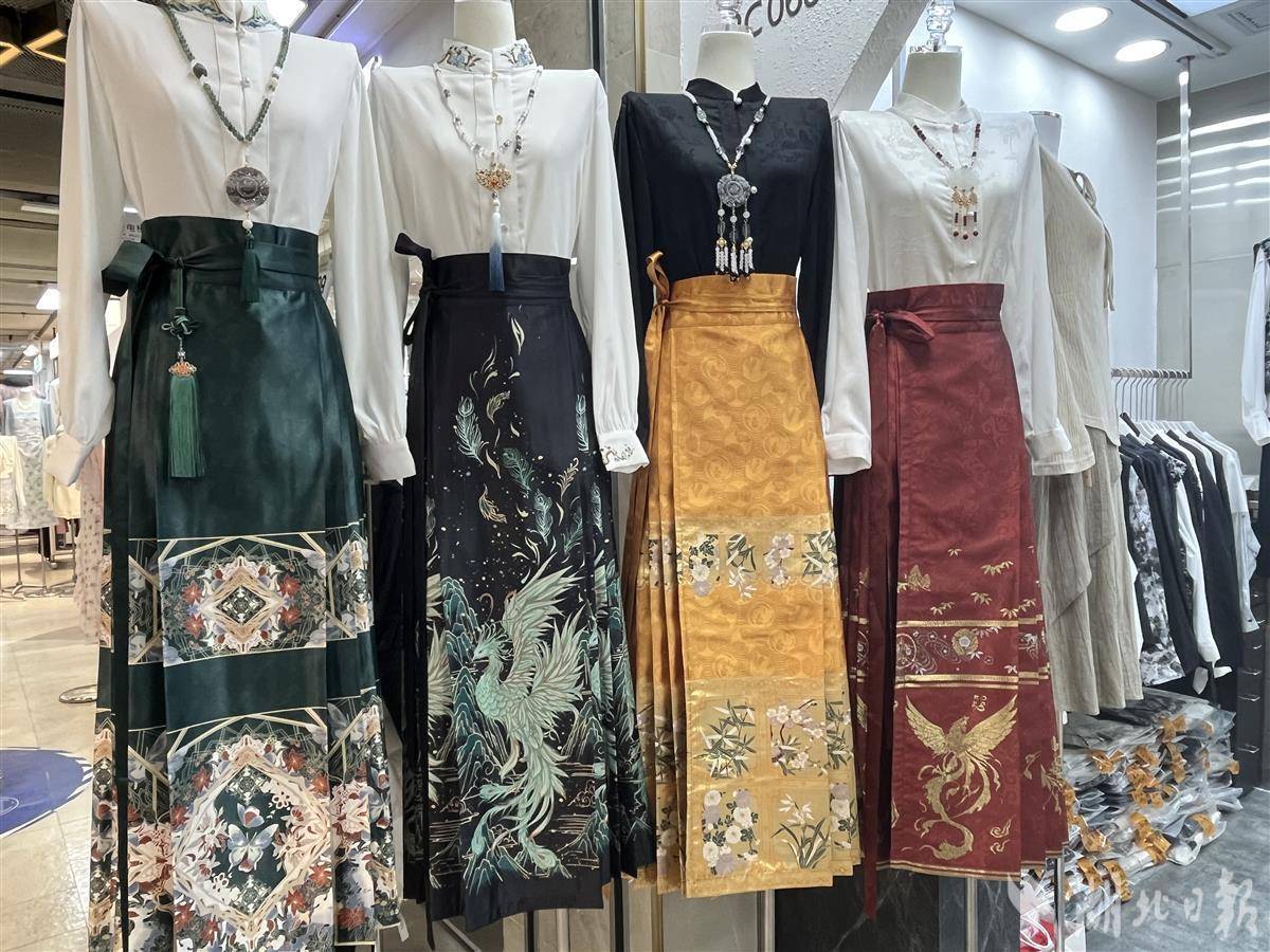“这款马面裙颜色选取了非常贵气的墨绿色,上面绣有花鸟、玉树等图案。款式是经典的五米摆六对褶,上紧下宽的设计更显气质。”位于云尚·武汉国际时尚中心的JL女装店铺主理人金小金忙得不可开交,正在给“组团”来的几位婆婆作介绍。