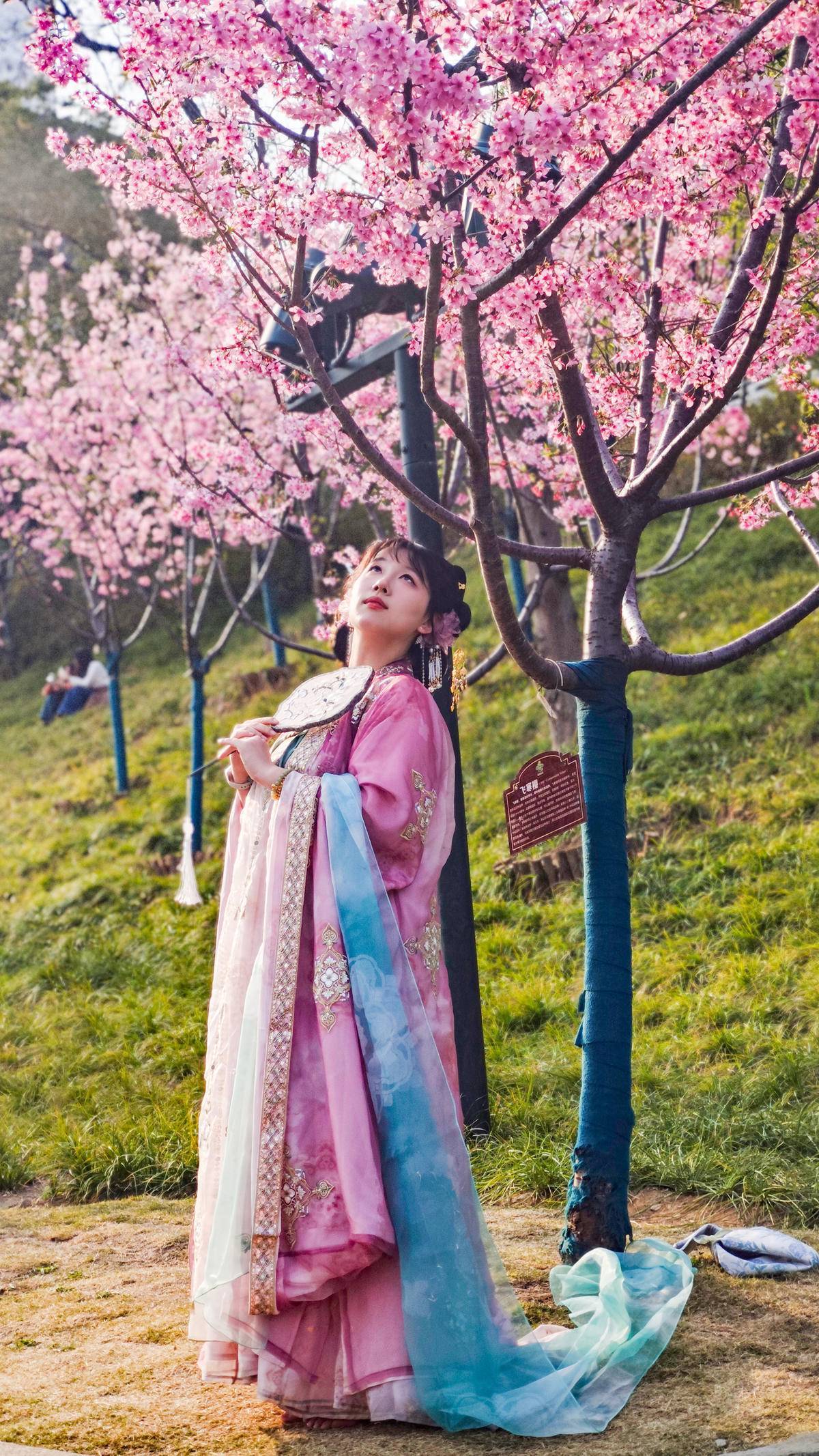 3月14日,身着国潮服饰的游客在武汉龟山赏樱拍照。(湖北日报全媒记者 何宇欣 通讯员 邹卉 摄)