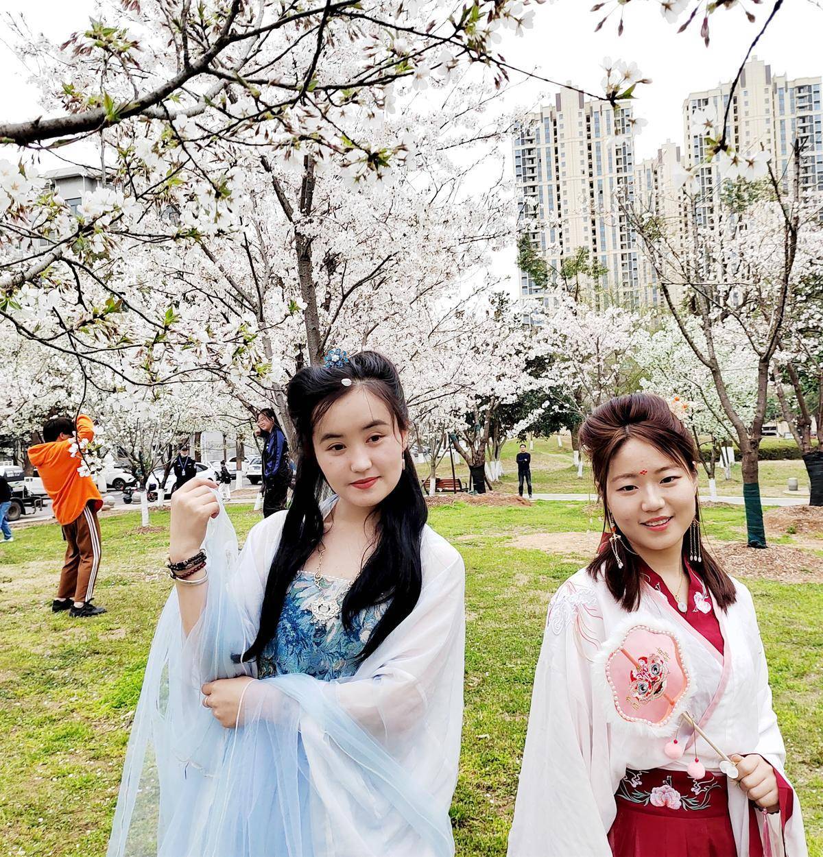 3月22日,中国地质大学(武汉)校园千棵连片樱花绽放,形成如云似锦花海,引来游客踏青赏玩打卡。学生们身着汉服与樱花合影拍照。 (湖北日报全媒记者张鸿 通讯员周志锋 张玉贤摄)