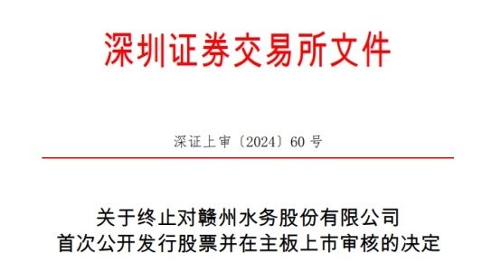中国经济网北京3月27日讯 深交所网站日前公布了关于终止对赣州水务股份有限公司(以下简称“赣州水务”)首次公开发行股票并在主板上市审核的决定。