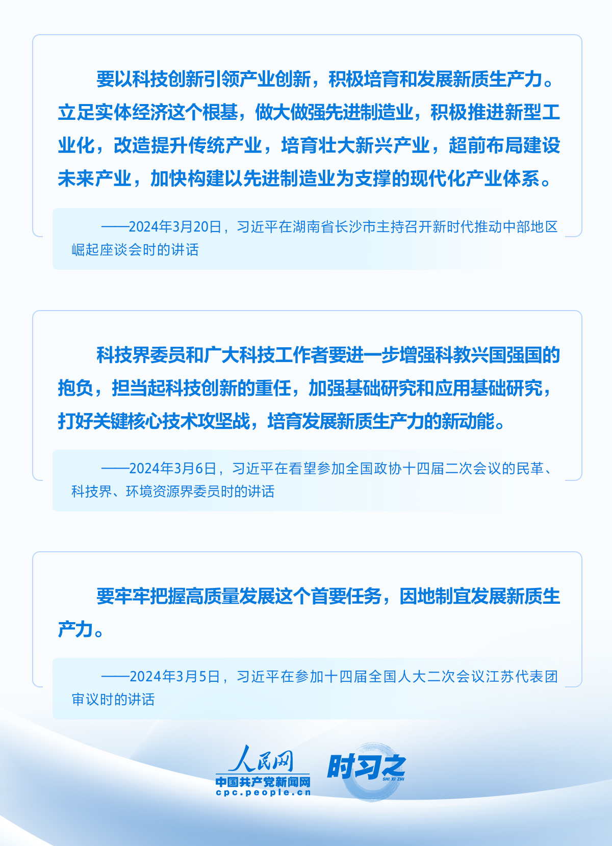 从2023年在地方考察时首次提出“新质生产力”这一重要理念,到在中央经济工作会议上部署“发展新质生产力”;从今年中共中央政治局集体学习时深刻系统阐释新质生产力,到全国两会期间为各地发展新质生产力指明行动路径,再到此次座谈会发表的重要讲话,关于发展新质生产力,总书记始终有着长远深邃的思考。