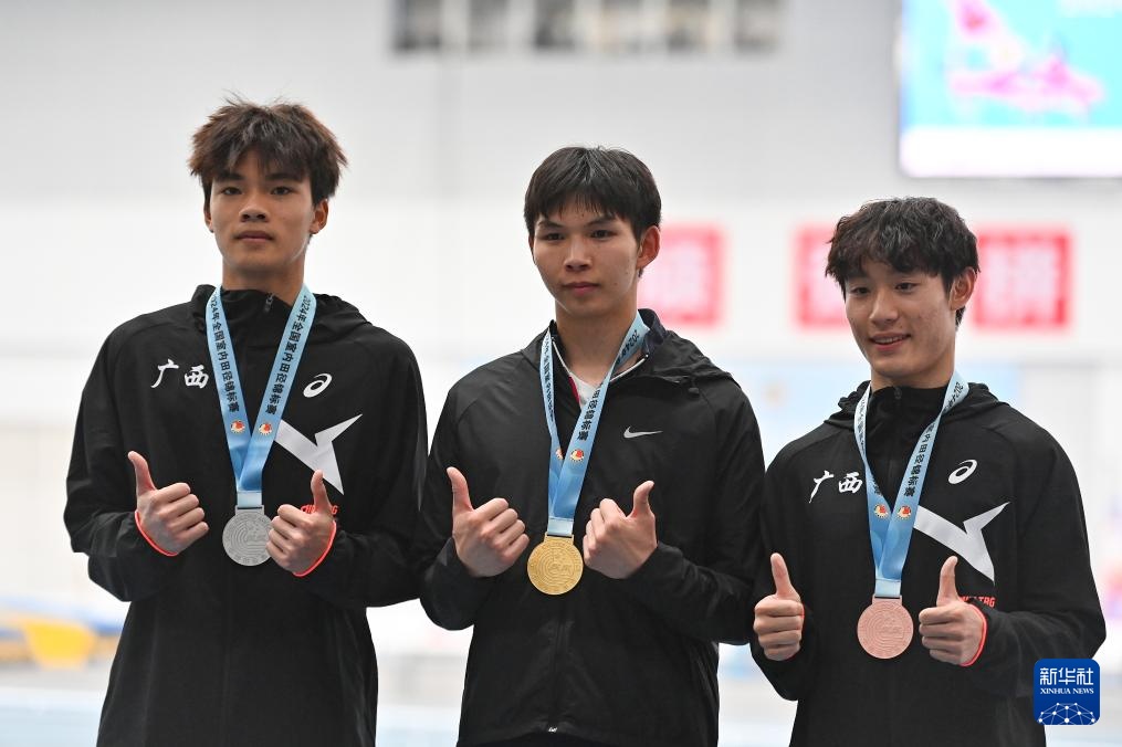 3月29日,冠军四川队选手黄友超(中)、亚军广西队选手曾克理(左)、季军广西队选手邓信锐在男子60米颁奖仪式上。新华社记者 宋彦桦 摄