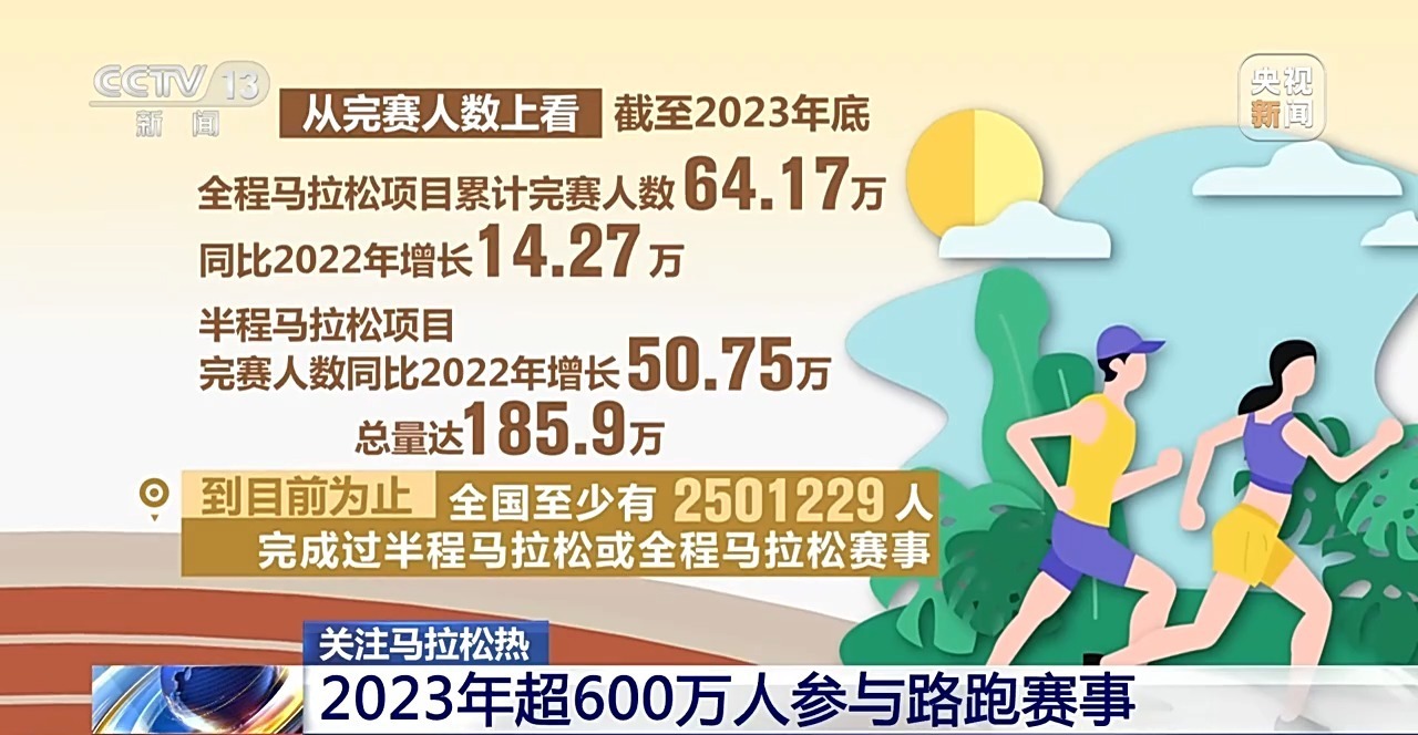 从完赛人数上看,截至2023年底,全程马拉松项目累计完赛人数64.17万,同比2022年增长14.27万,半程马拉松项目完赛人数同比2022年增长50.75万,总量达185.9万。到目前为止,全国至少有250万人完成过半程马拉松或全程马拉松赛事。