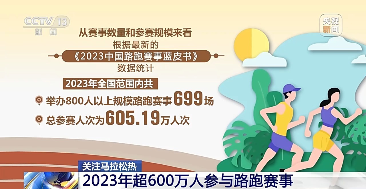 那么路跑赛事到底有多火?近日,中国田径协会发布了《2023中国路跑赛事蓝皮书》,报告显示,2023年全年共举办699场马拉松,总参赛人次为605.19万人次。无论从赛事数量、参赛规模,还是完赛成绩,都显示出中国的路跑活动方兴未艾、蓬勃生长的态势。