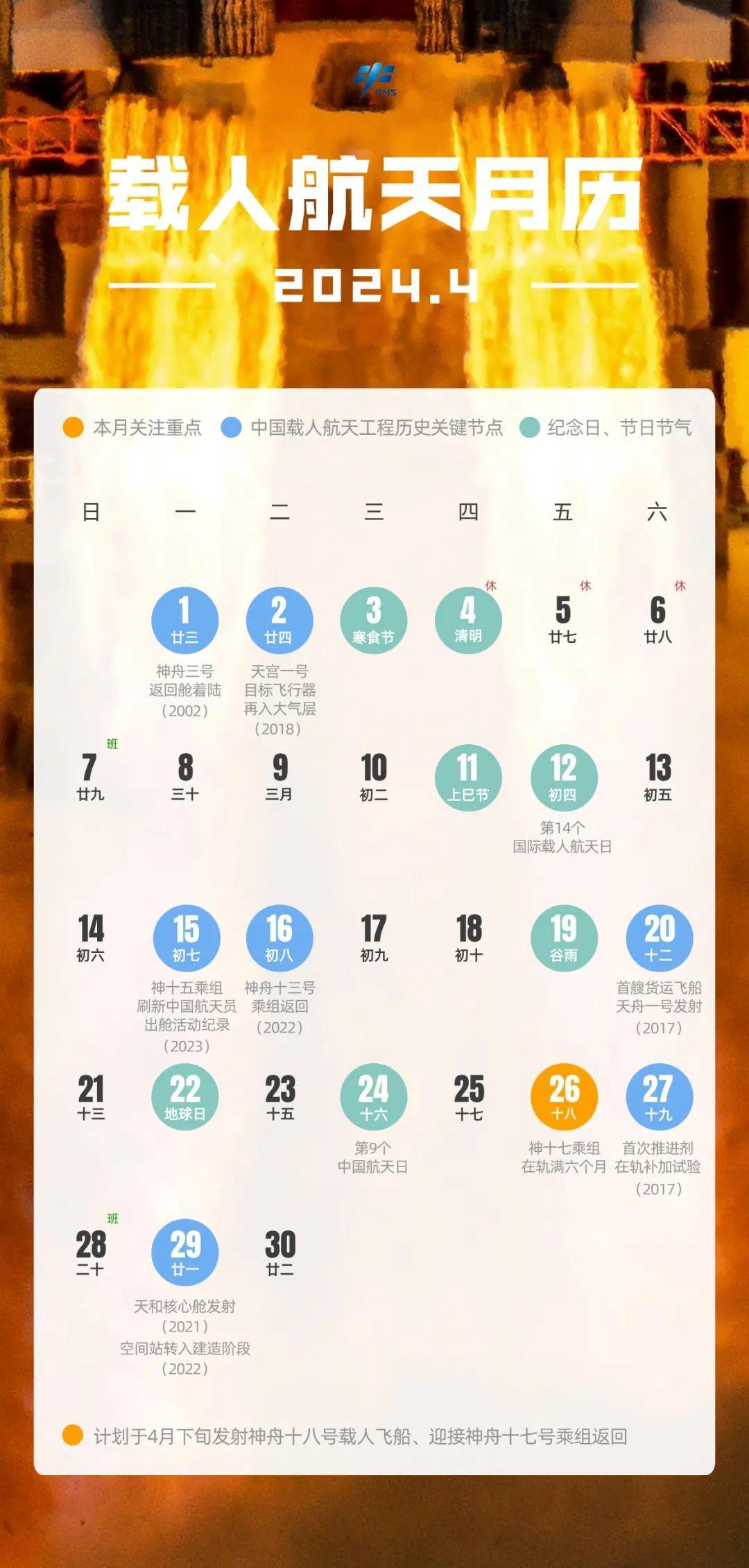 载人航天4月日历来了,计划于4月下旬发射神舟十八号载人飞船、迎接神舟十七号乘组返回,一起期待!祝福中国航天!