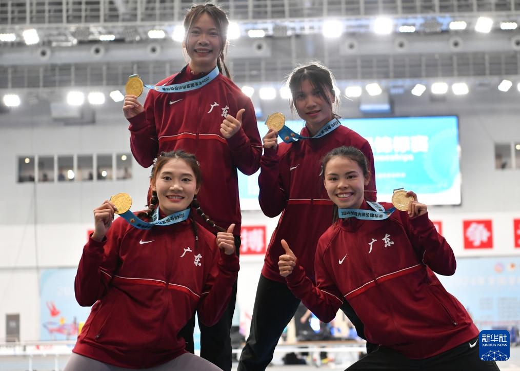 3月30日,冠军广东队梁诺、孔莹蓥、严海玲、莫家蝶(从左至右)在颁奖仪式上。
