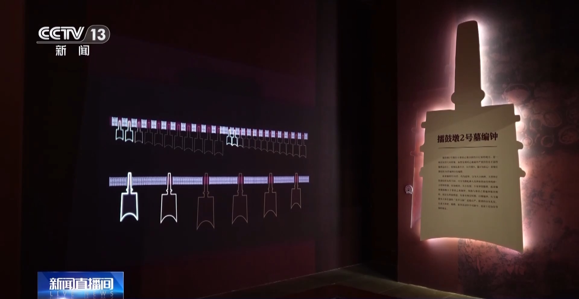 而为了让现场观众们也可以与文物互动,展览现场还设置了一个弹奏“数字编钟”的墙面。通过触摸展板上的“编钟”,使其发光并演奏出“宫商角徵羽”,使得观众们可以借助数字科技体验到古编钟在音韵和造型上的美。