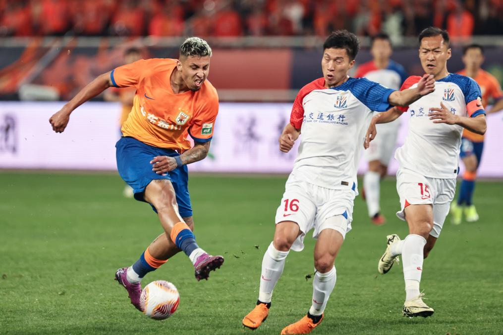 3月31日,山东泰山队球员克雷桑(左)在比赛中射门。新华社记者 朱峥 摄