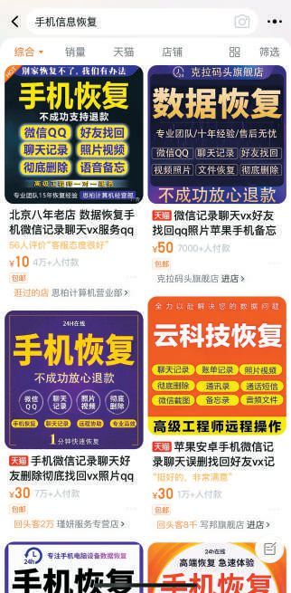 然而,在网购平台上,存在大量自称可以进行数据恢复的店铺。记者向两家网店咨询恢复出厂设置后能否找回数据。一家店铺客服立即表示“可以操作”,另一家的客服则在询问过品牌、型号后,称可以先下单检测试试。两家店铺都在服务声明中指出“本店仅对自己的设备进行恢复”,但对于顾客是不是手机机主,客服并没有进行询问。