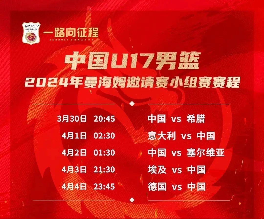 正是为了更好备战U17世界杯,中国U17男篮选择出征2024年曼海姆邀请赛。中国队被分在B组,同组对手还有希腊队、意大利队、塞尔维亚队、埃及队、德国队。