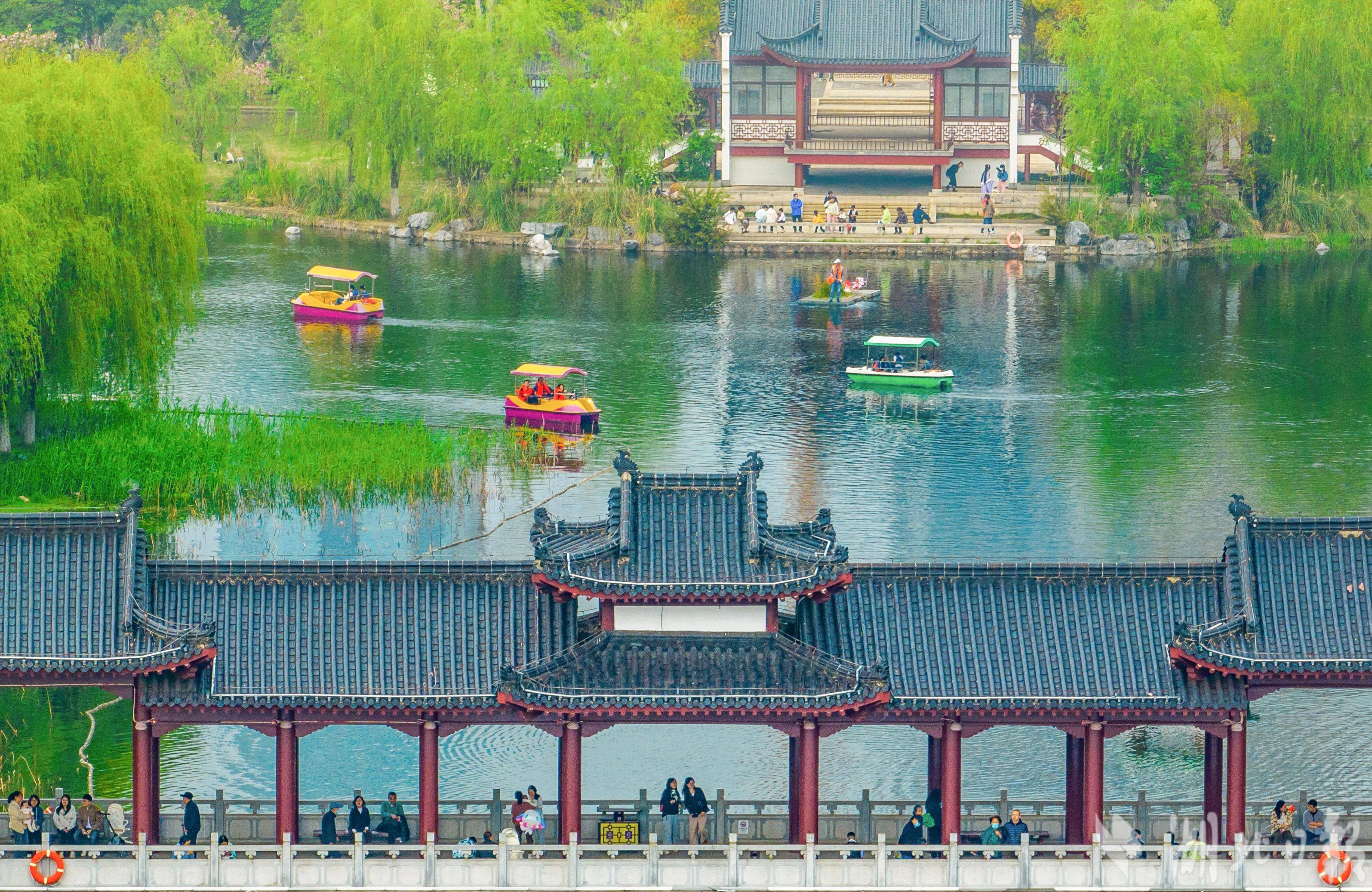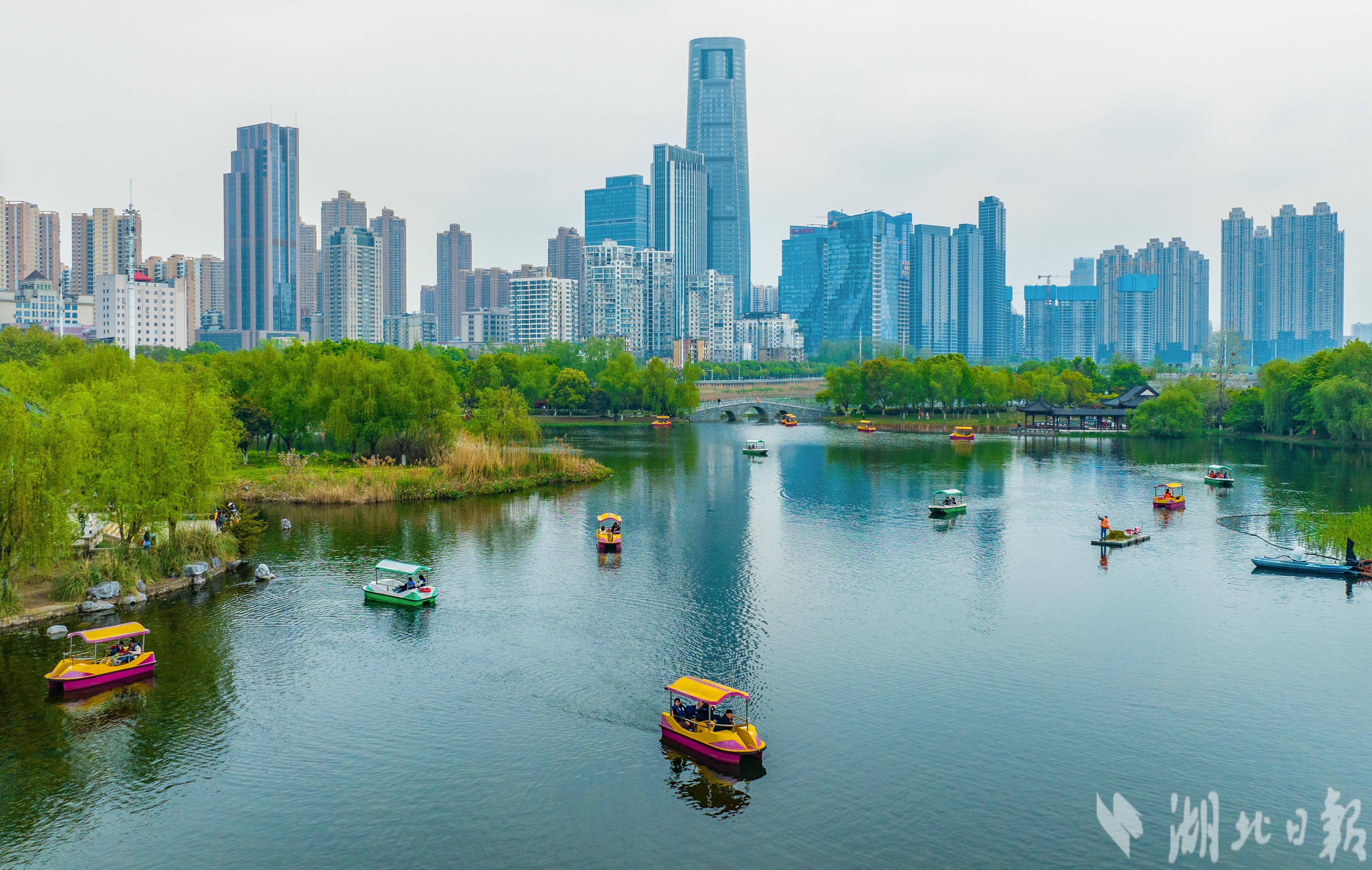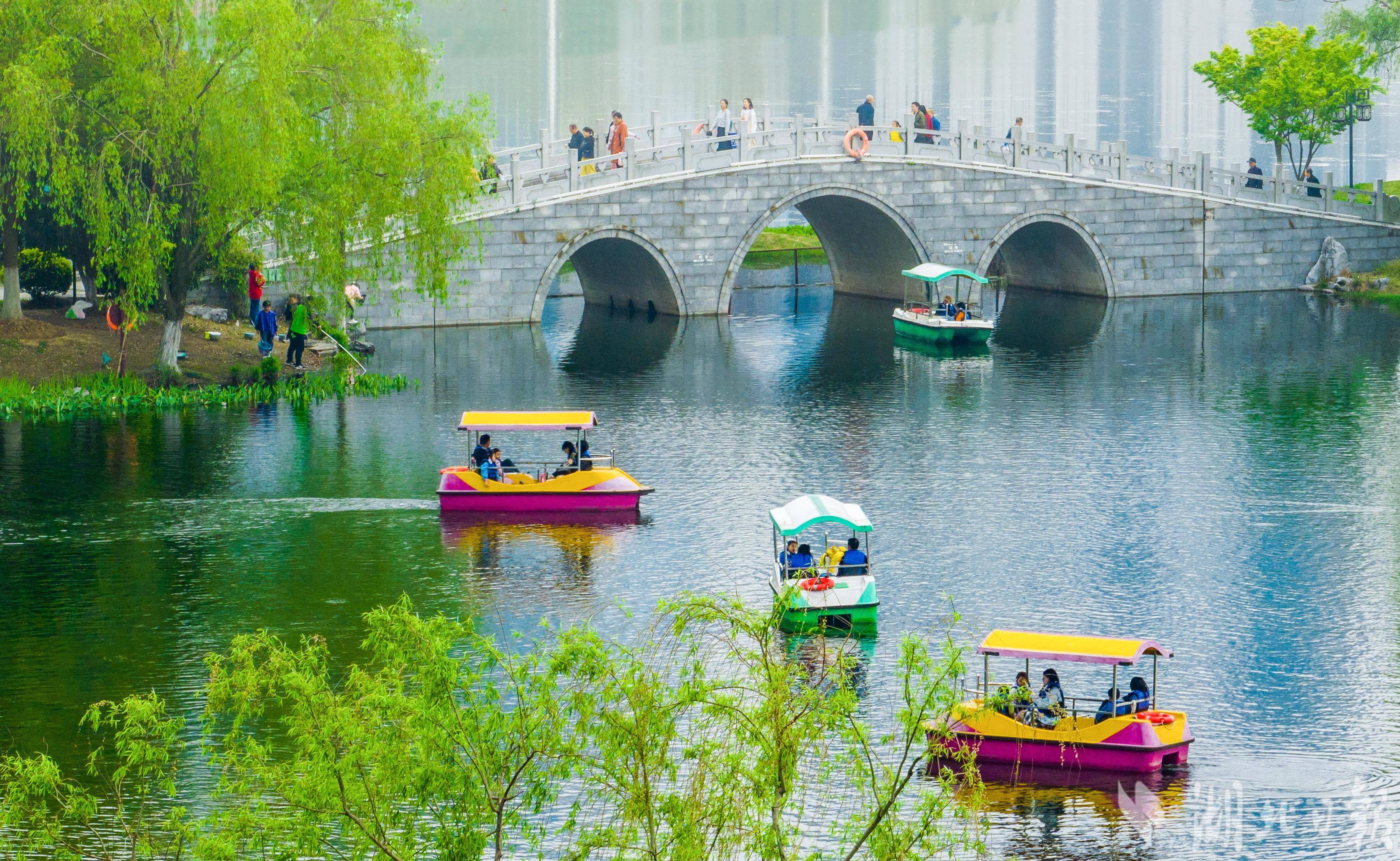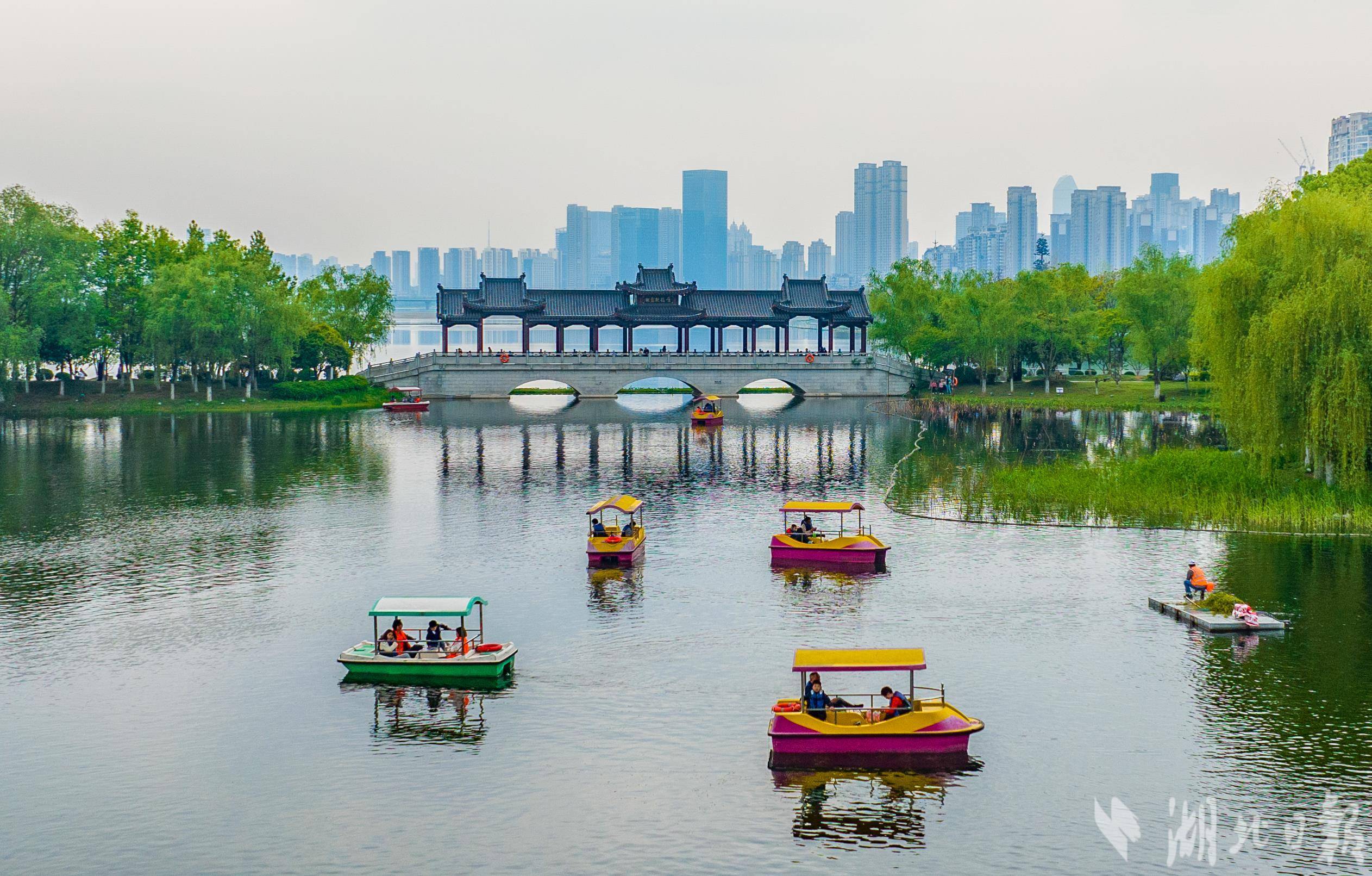 4月6日,市民游客在武汉市沙湖湿地公园乘船游玩。武汉是人口超千万的“国际湿地城市”,清明时节,湿地城市绿意盎然,吸引各地游客前来赏春踏青,亲近大自然。(湖北日报全媒记者 薛婷 摄)