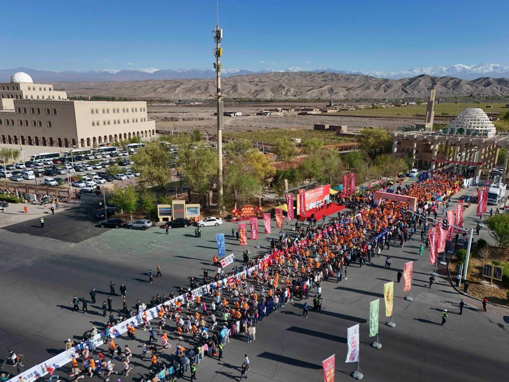 抬眼北望,远处天山覆雪,赛道旁田间数十万亩葡萄新芽初露,大道上奔跑的人群正展示着向前冲刺的干劲。