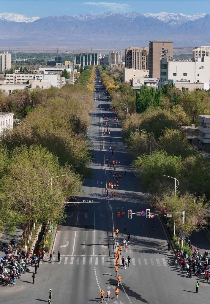 4月6日,参赛选手奔跑在新疆吐鲁番市城区(无人机照片)。新华社记者 胡虎虎 摄