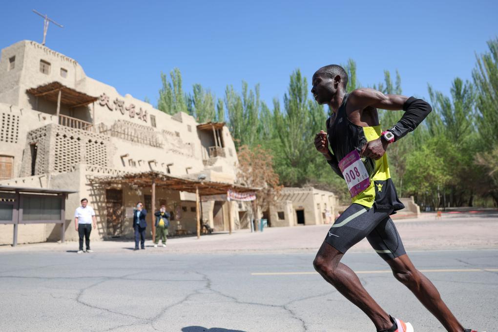 4月6日,肯尼亚选手姆万吉·詹姆斯·卡柳基在比赛中经过一片古村落。新华社记者 胡虎虎 摄