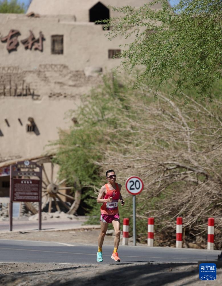 4月6日,一名全程马拉松参赛选手在比赛中经过一片古村落。新华社记者 胡虎虎 摄