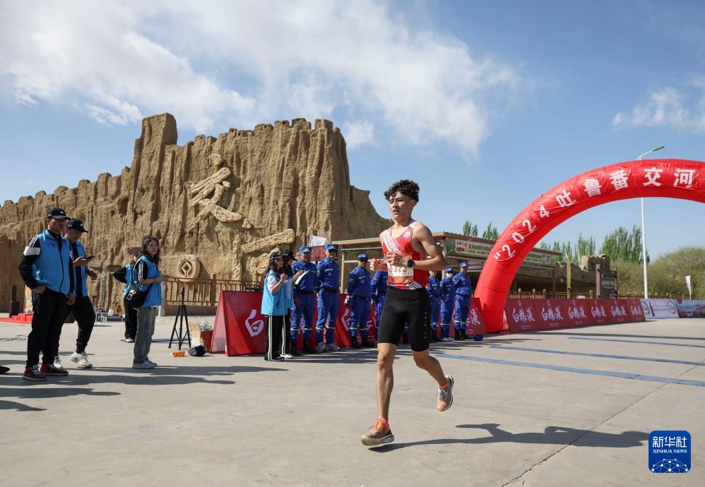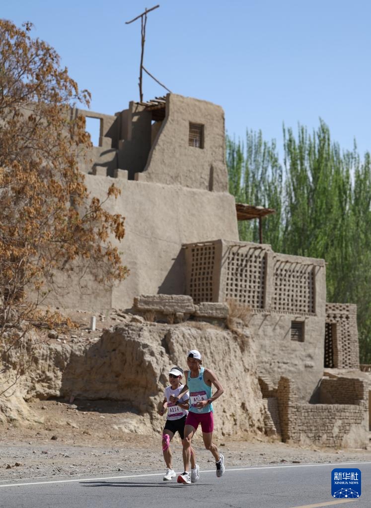 4月6日,一名半程马拉松参赛选手跑过位于世界文化遗产交河故城旁的终点。新华社记者 胡虎虎 摄