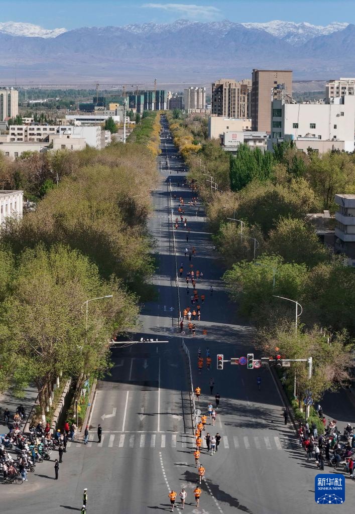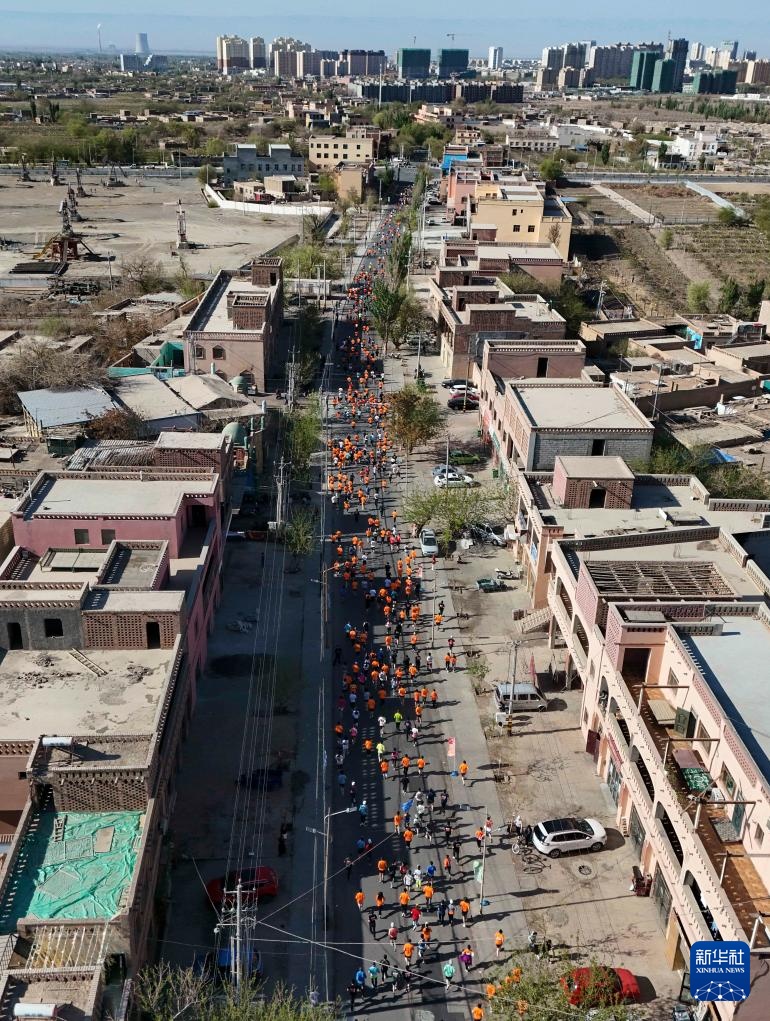 4月6日,参赛选手奔跑在新疆吐鲁番市城区(无人机照片)。新华社记者 胡虎虎 摄