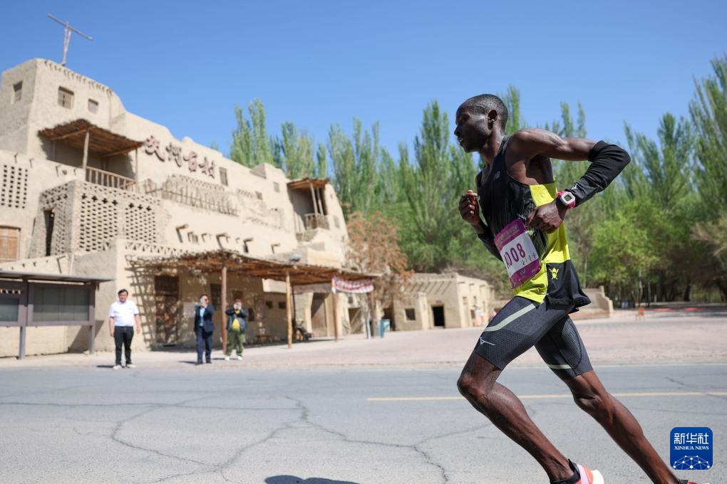 4月6日,肯尼亚选手姆万吉·詹姆斯·卡柳基在比赛中经过一片古村落。新华社记者 胡虎虎 摄