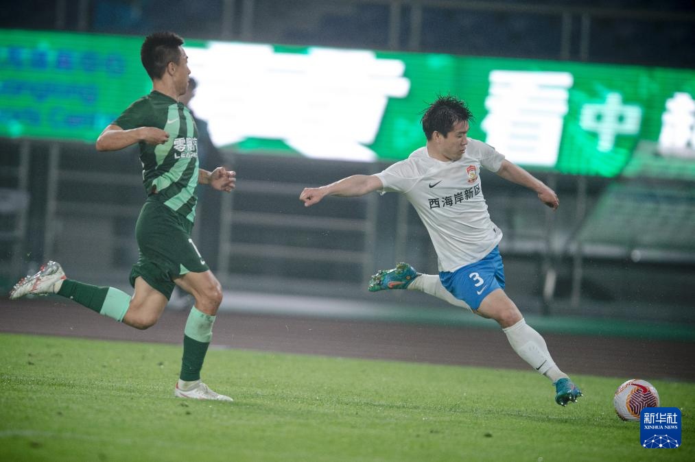 4月6日,青岛西海岸队球员里亚斯科斯(右)在比赛中射门。新华社记者 江汉 摄